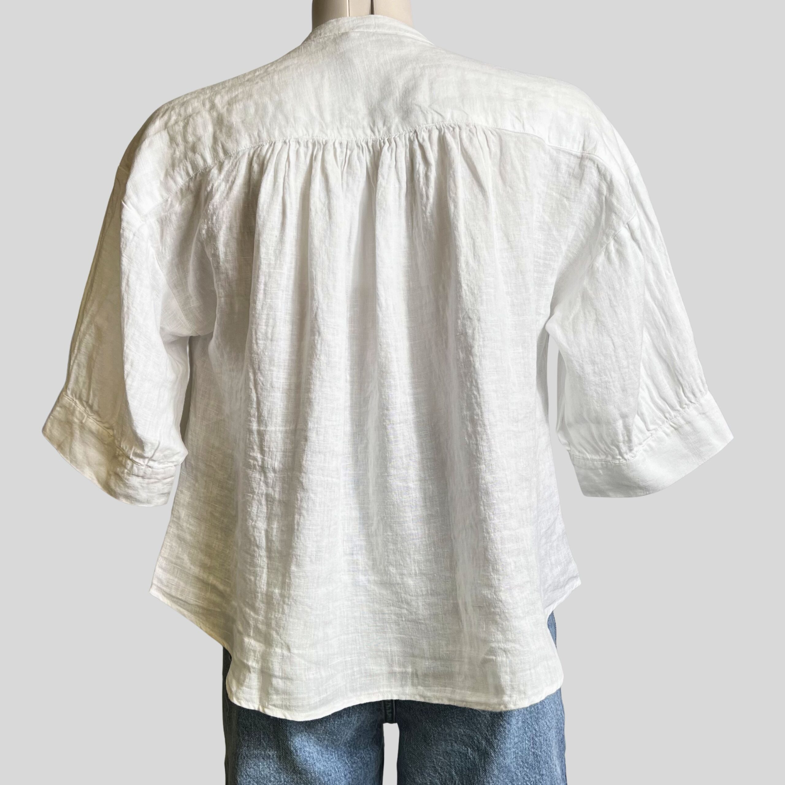 Sa coupe relaxed lui confère une allure moderne et décontractée. Le col légèrement froncé ajoute un détail subtil qui structure la pièce tout en conservant un style épuré. Les manches courtes larges accentuent cette sensation de légèreté et offrent une silhouette douce et féminine.