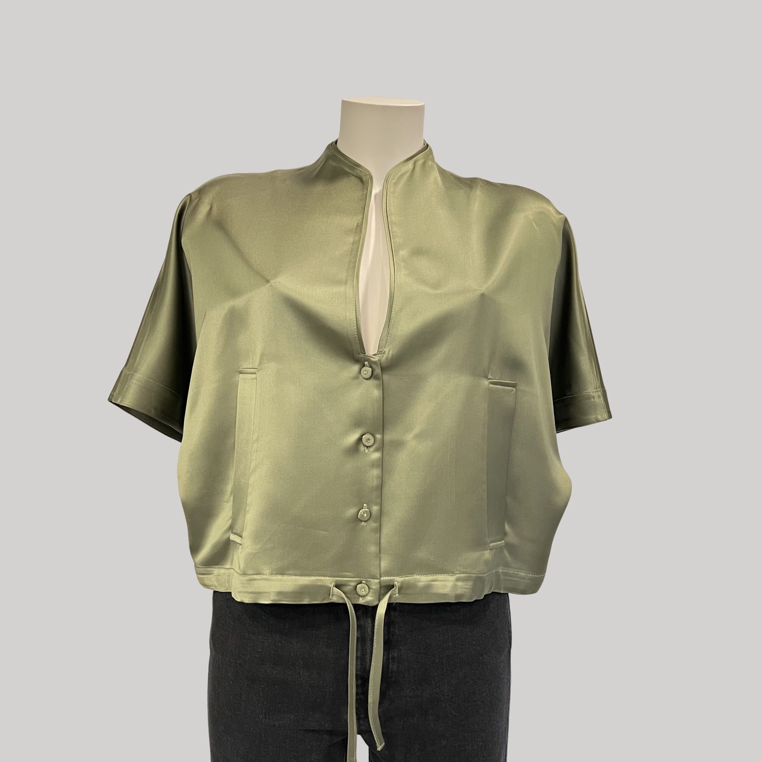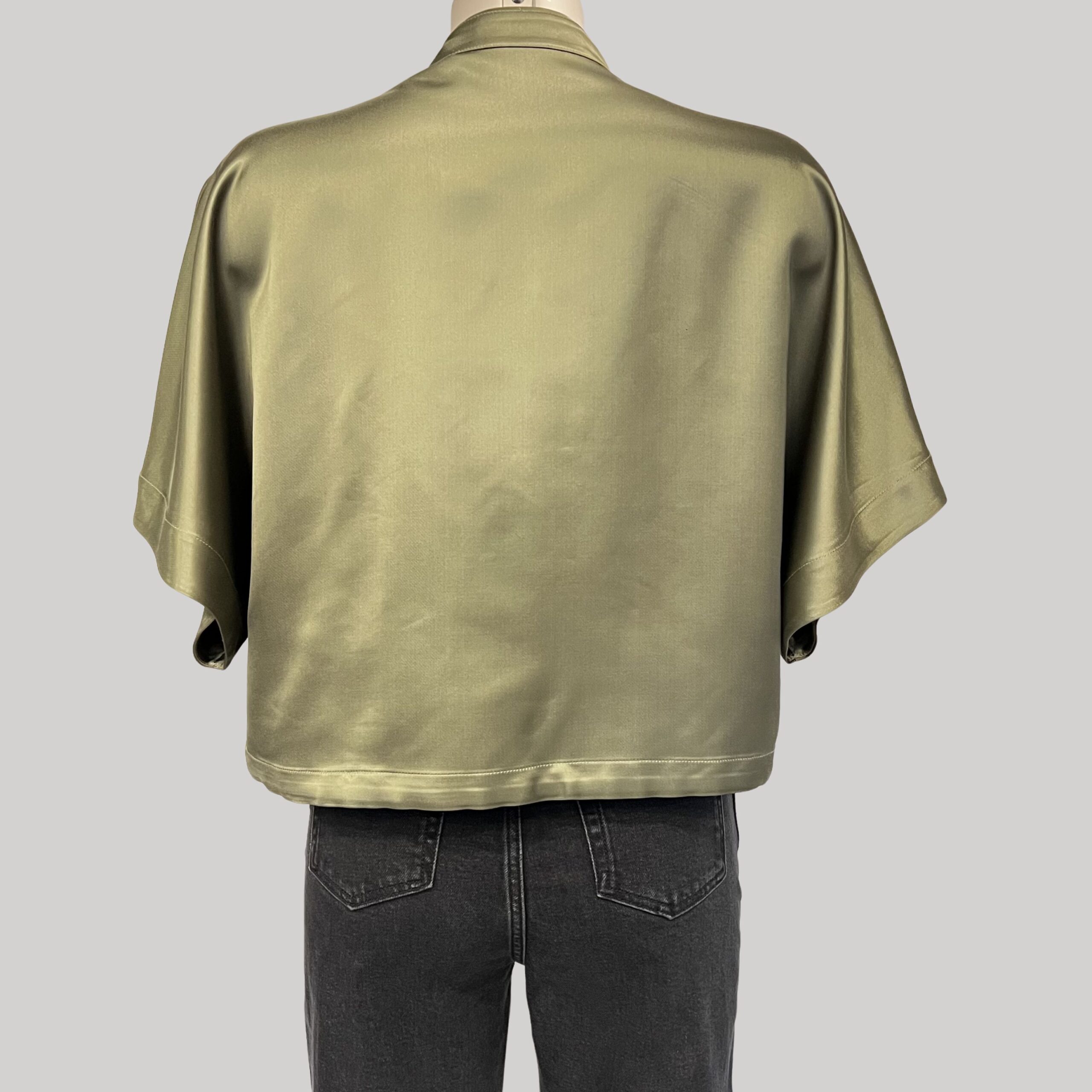 Sa teinte kaki satin, à la fois profonde et lumineuse, apporte une dimension naturelle et sophistiquée au vestiaire féminin. La coupe droite et fluide structure la silhouette tout en conservant un mouvement léger et aérien. L’encolure arrondie sans col accentue son allure contemporaine.