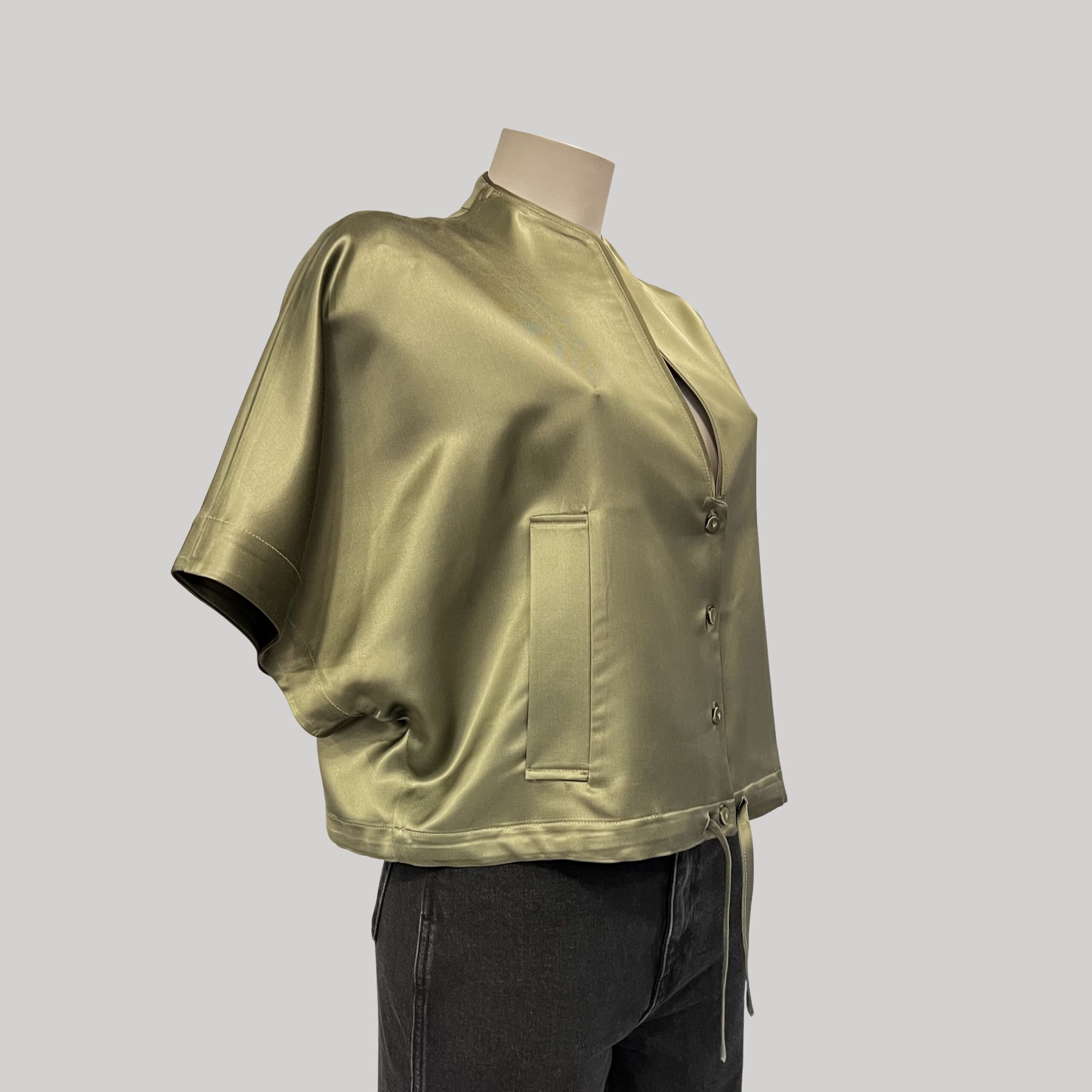 Le kaki satin constitue une alternative moderne aux tons classiques. Il se marie facilement avec des nuances neutres ou plus claires, permettant de composer des looks variés, du plus minimaliste au plus affirmé. Les liens de serrage ajoutent une dimension pratique et féminine à cette pièce signature.