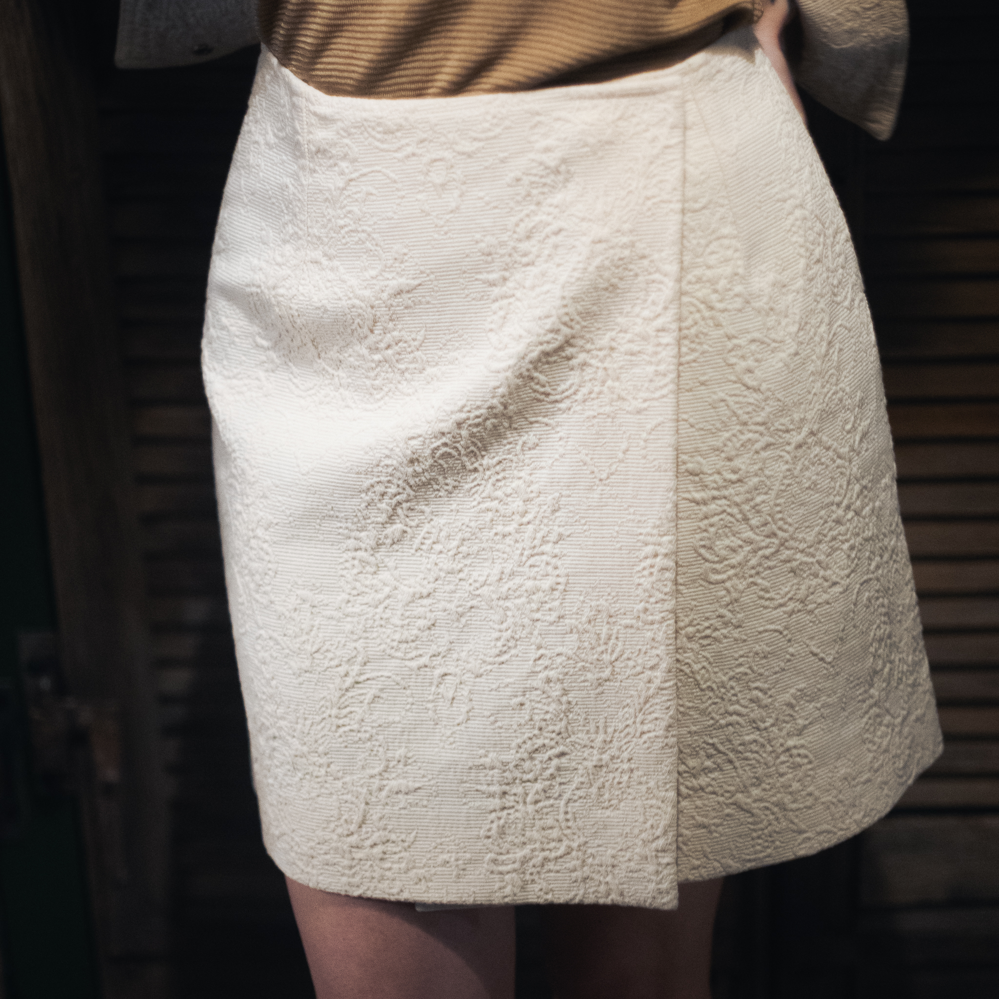 Jupe courte portefeuille en 100% coton Margaux Lonnberg. Elle est Ă©lĂ©gante et confortable, le tissus dĂ©licatement texturĂ©, effet damassĂ©. Une piĂšce fĂ©minie et chic. La chemise Egan dans le mĂȘme tissus ira parfaitement avec en surchemise, pour un total look.
