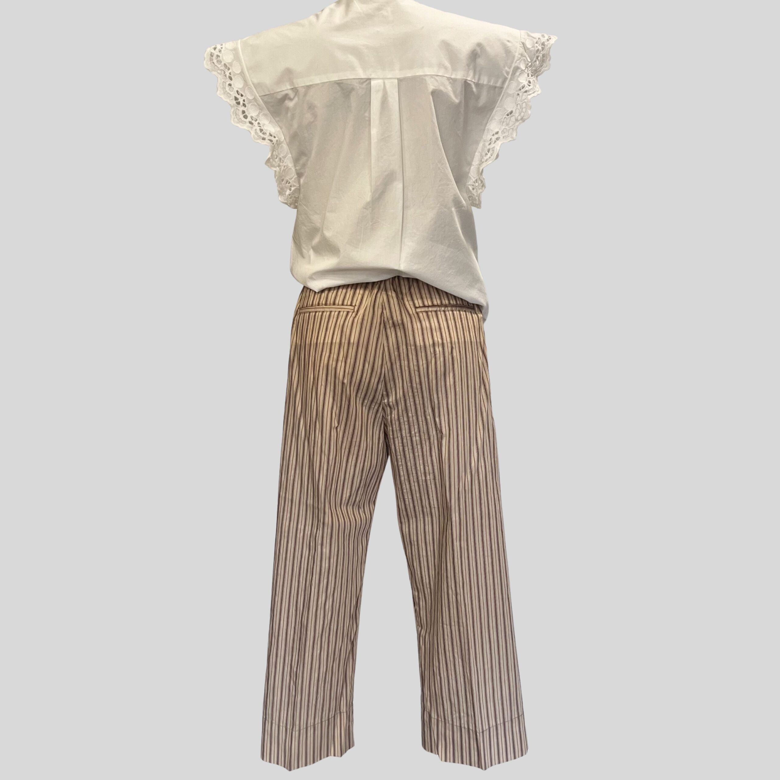 Son motif de rayures verticales dans des tons beige sable et terracotta apporte une touche graphique subtile tout en restant facile à porter. Ces nuances naturelles donnent au pantalon un caractère élégant et lumineux.