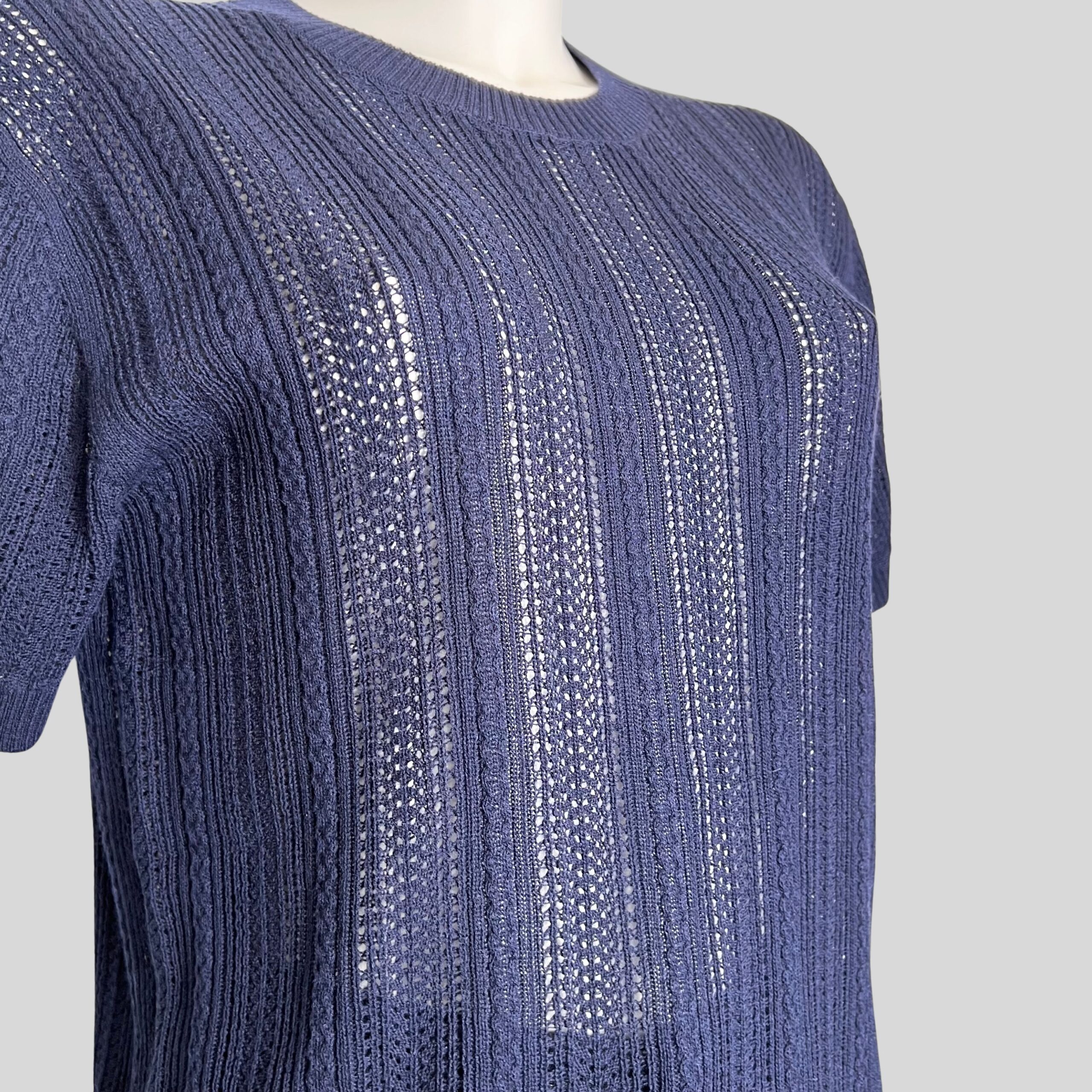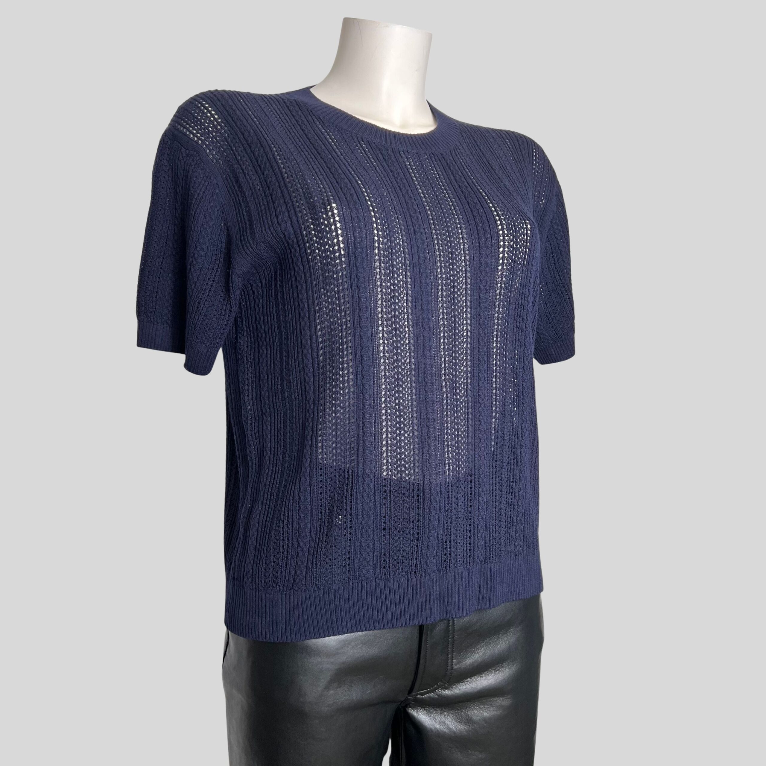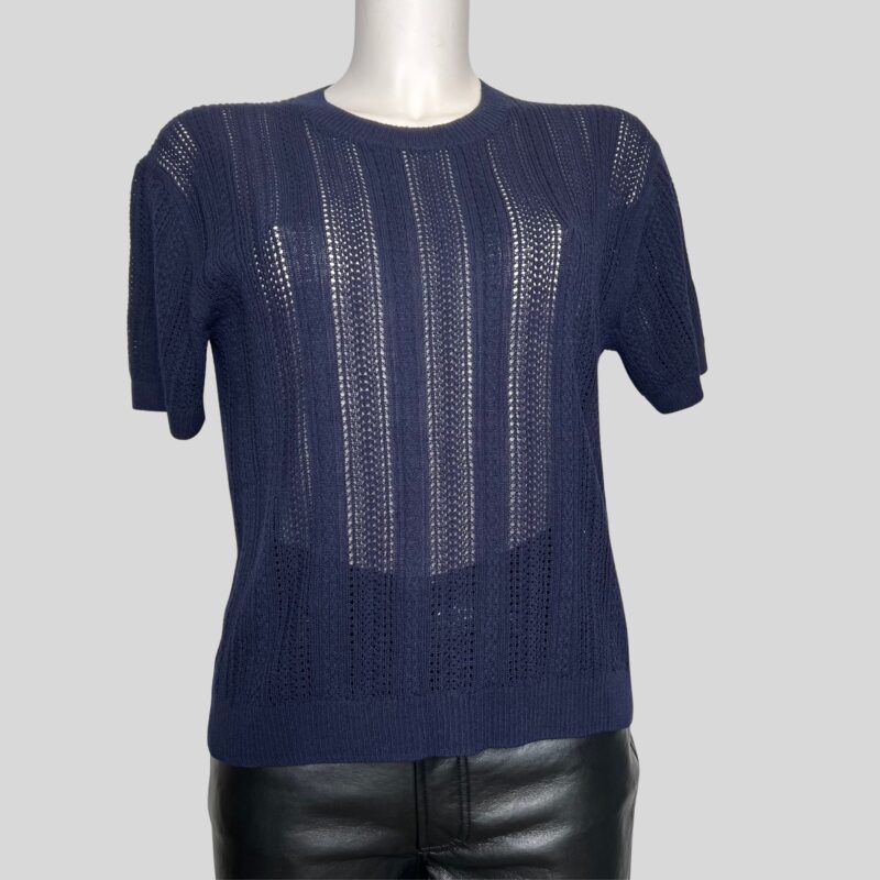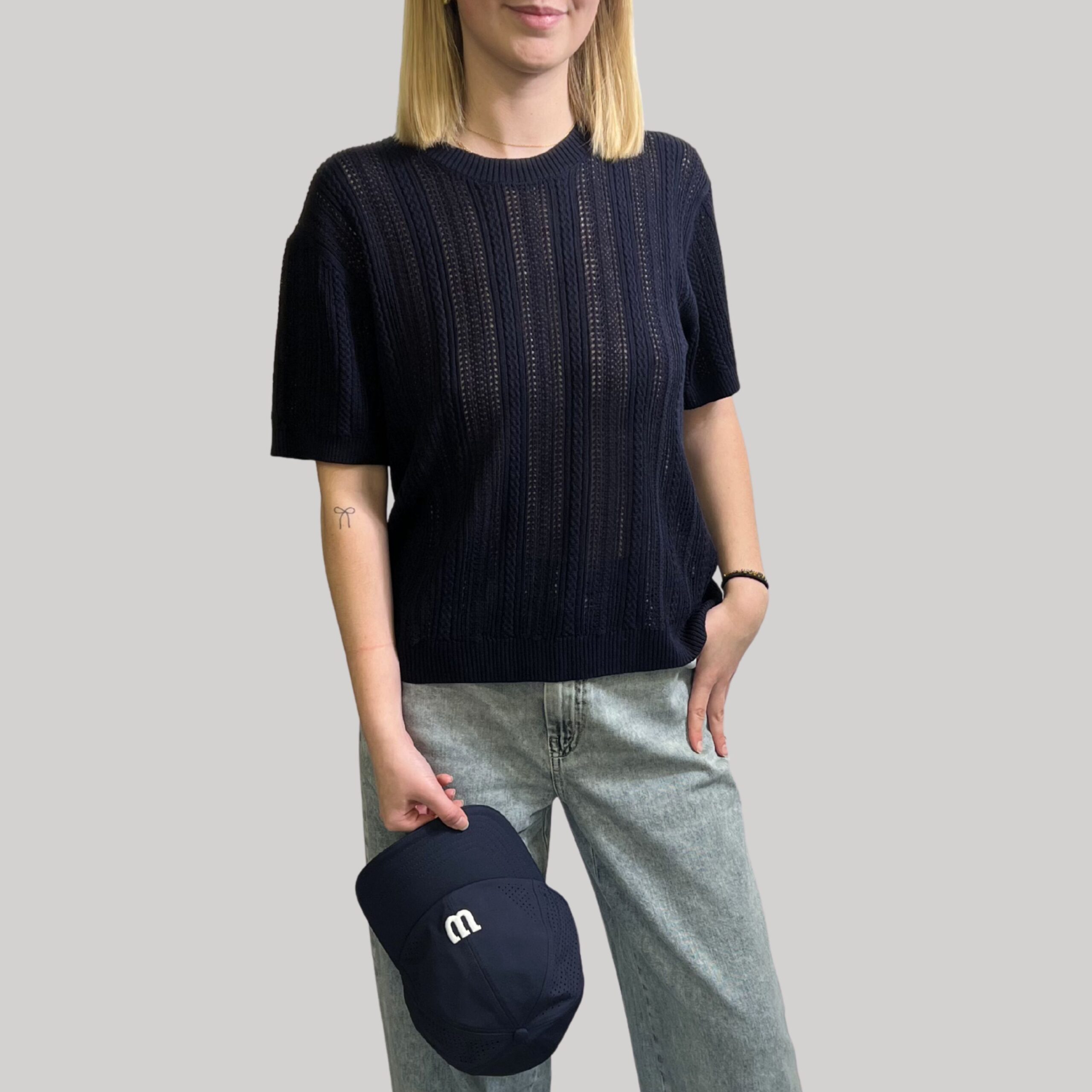 La coupe ample, associée à une longueur classique, assure un tombé élégant et confortable. Les manches courtesrenforcent la légèreté du modèle et en font une pièce facile à porter au quotidien. Le coloris marine, profond et intemporel, met en valeur le motif pointelle et apporte une élégance discrète.